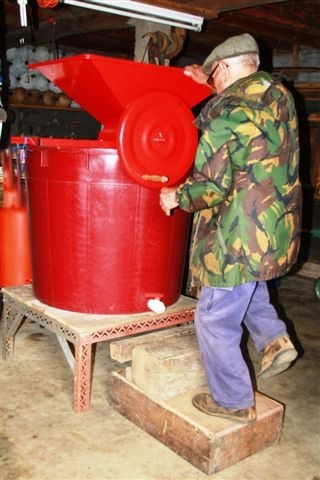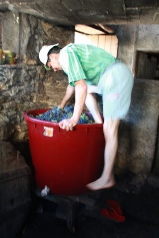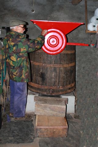 Na loja, a dorna esperava com a esmagadeira em cima e um degrau à frente para facilitar a tarefa de despejar as uvas directamente dentro da cuba. Despejado um carrego, esmagavam-se logo as uvas, dando à manivela. Contrariamente ao que eu pensava, afinal a maquineta não esmaga as grainhas que confeririam mau sabor ao vinho! Limita-se a soltar os bagos do cardaço, e a amachucá-los levemente.