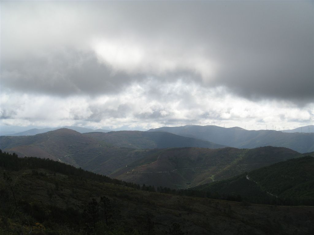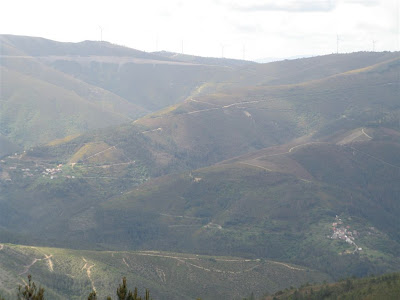 freguesia do Colmeal. Lá no alto as eólicas, no gigantismo das suas silhuetas,